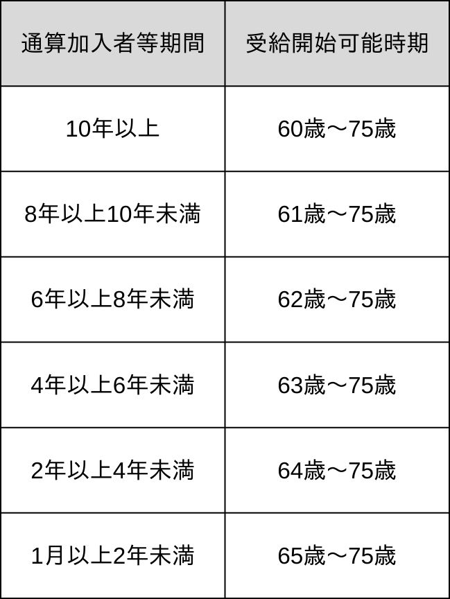 - 通算加入者等期間の合計が10年に満たない場合、加入年数の合計に応じて受給開始時期が先延ばしされます。(右記表参照)